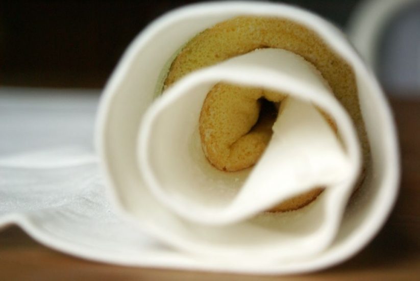 Upieczone ciasto,wyciągamy z formy i przekładamy na rozłożoną ściereczkę papierem do góry. Kiedy lekko ostygnie, ściągamy papier, a biszkopt zwijamy razem ze ściereczką i odstawiamy do całkowitego wystudzenia.