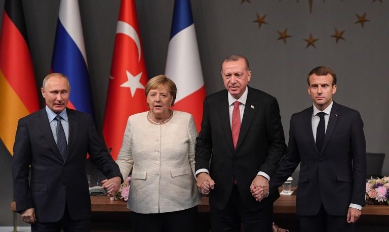 Wspólna fotografia, na której Putin, Merkel, Erdogan i Macron trzymają się za dłonie była podsumowaniem rozmów czworga przywódców, które miały miejsce w Stambule na temat sposobów zakończenia trwającej od ponad 7,5 roku wojny domowej w Syrii, w której do tej pory zginęło ponad 400 tysięcy osób. W komunikacie przywódcy podkreślili konieczność rozpoczęcia procesu pokojowego pod auspicjami ONZ, trwałe zawieszenie broni oraz kontynuowania walki przeciwko terroryzmowi.