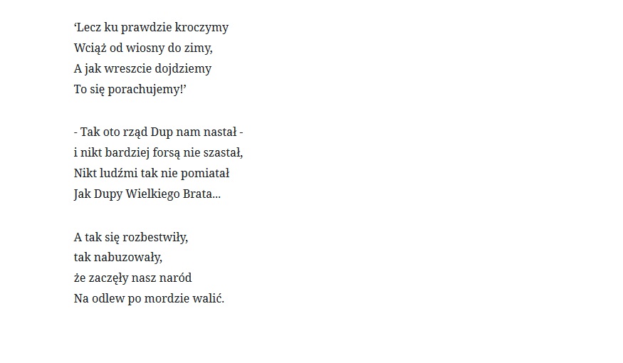 Słowo "dupa" ma długą tradycję w historii i literaturze polskiej oraz naszym języku i życiu codziennym i swobodnie używane było publicznie i twórczo między innymi przez tak wybitnych Polaków jak Marszałek Piłsudski i Mistrz Julian Tuwim. Jest też w codziennym użyciu przez miliony Rodaków w zmaganiach z niełatwą rzeczywistością czasów "Durnej Zmiany", kiedy mniej lub bardziej wariackie posunięcia rządu odsyłane są "do dupy"...