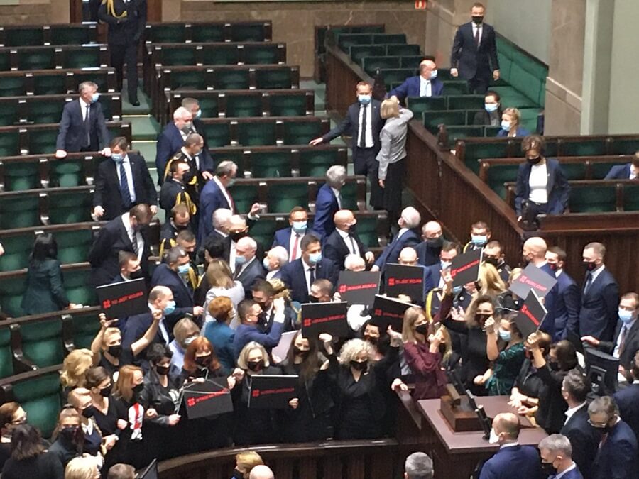 Przepychanki podczas posiedzenia Sejmu. Posłanki opozycji zablokowały mównicę. Z plakatami popierającymi strajki kobiet próbowały podejść do Jarosława Kaczyńskiego. Każda z nich miała ze sobą czarną tabliczkę z czerwonym napisem „Kobieta decyduje". Drogę zagrodziły im posłanki PiS.