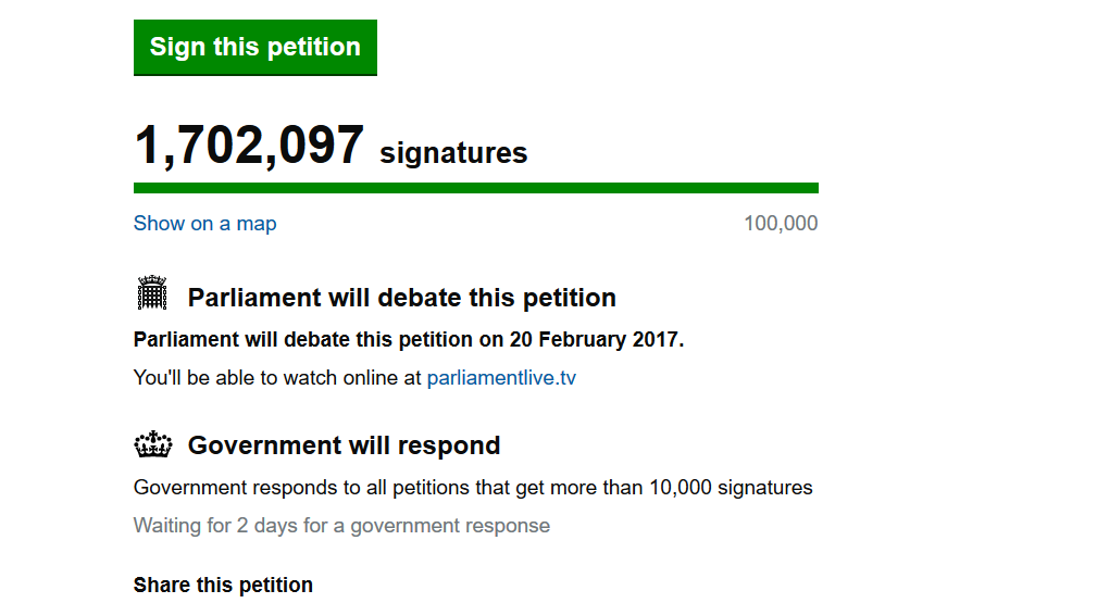 Dobata w kwestii wizyty prezydenta Trumpa w WielkiejBrytanii, jest planowana na 20 lutego br. Posłowie mają wtedy również rozważać konkurencyjną petycję popierającą wizytę Donalda Trumpa, która w chwili obecnej ma 116,467 głosów.