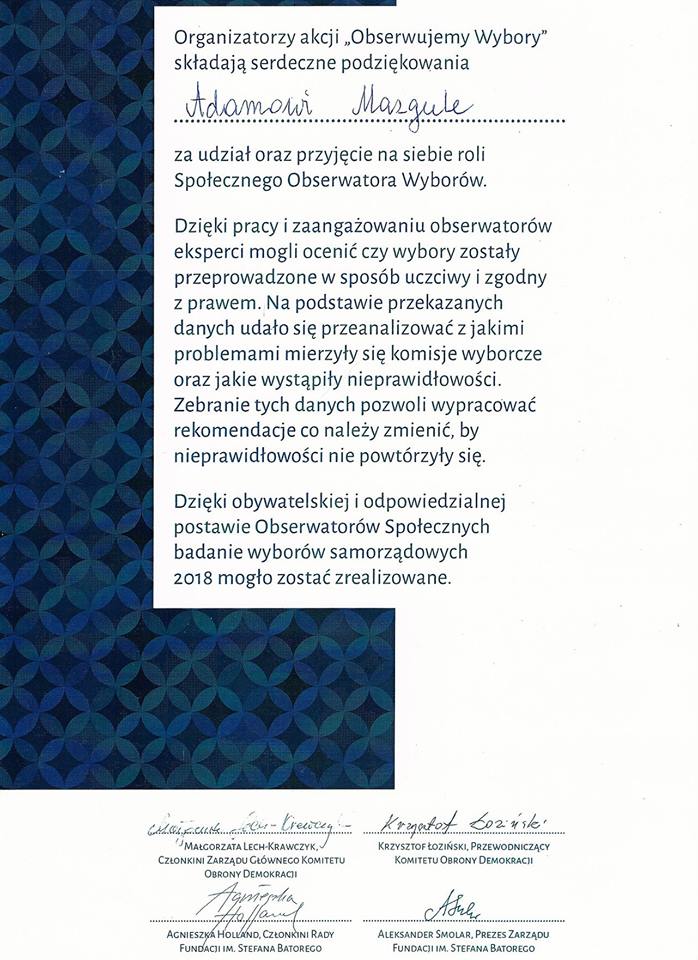 Otrzymałem podziękowanie od Fundacji im. Stefana Batorego i KOD za zaangażowanie w obserwację wyborów samorządowych i bardzo mnie to cieszy. Mam nadzieję, że i w następnych wyborach nie będzie prób wpływania na ich wynik przez komisje wyborcze.