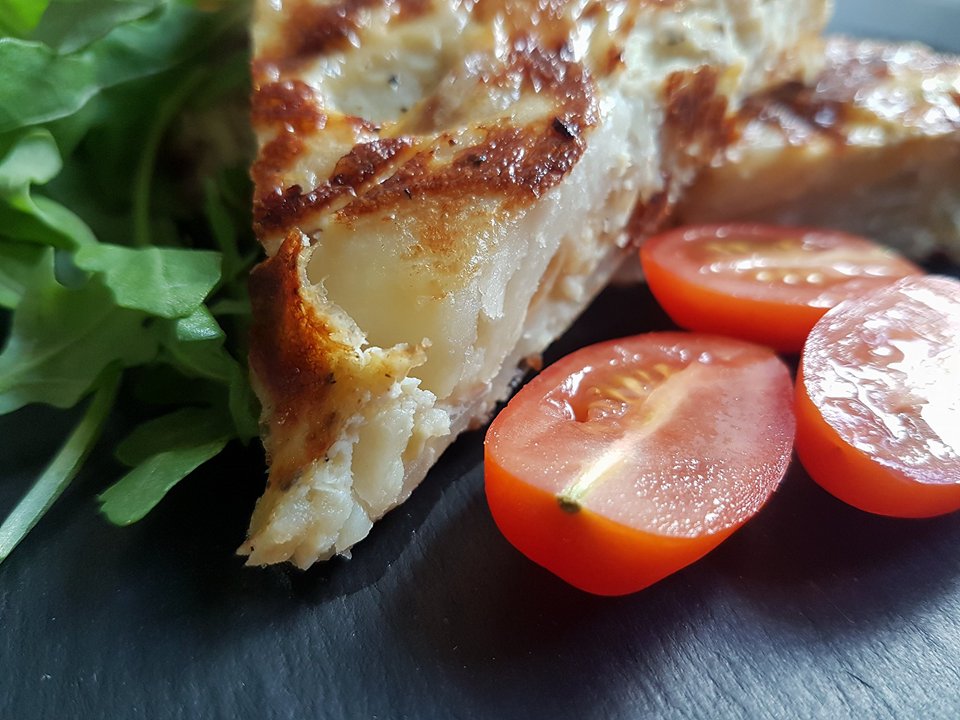 Tortilla jest gotowa. Można ją serwować z sałatką z pomidorów, rukolą czy posypaną zieloną cebulką.