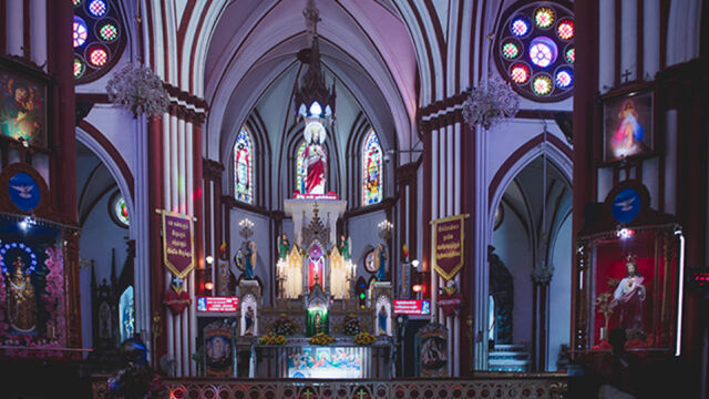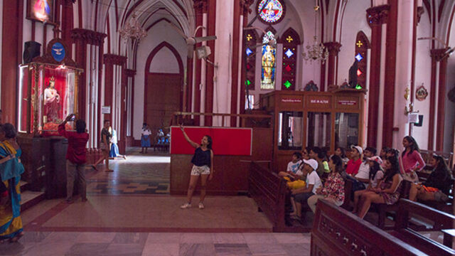Wróciłem do miasta. Wysoka Bazylika Najświętszego Serca Pana Jezusa, utrzymana w gotyckim stylu budowla, pozostała do dziś. Obok po ulicy przechadzają się chrześcijanie, muzułmanie i hindusi, a wszyscy tak samo śpieszący do swych codziennych obowiązków. Przed wejściem do przybytku, sporych rozmiarów, tuż po lewej, napis z prośbą o niepozostawianie butów na zewnątrz, obok dziesiątek już zżutych ze zmęczonych stóp. Powoli zanurzałem się w chłód kościelnego cienia. Wnętrze wyjątkowo oddawało to co pierwsi księża próbowali wnieść na ten ląd. W oknach stare witraże swoją świetnością pamiętające obecność francuzów, ołtarz główny, ciało Chrystusa ułożone w przeszklonej gablocie, wystawione na widok przypominało to co nazywane jest tu: darśana. Zobaczyć by uwierzyć, dotknąć by pojąć, a co najważniejsze uczestniczyć w błogosławieństwie spływającym od bóstwa poprzez oglądanie go, bądź to w wizji, bądź fizycznie poprzez symbol.