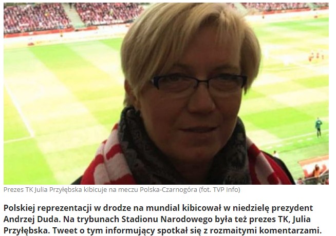 "Prezes Julia Przyłębska na trybunach Narodowego. Przynosi szczęście" - zatytuowanno artykuł w portalu TVP Info. W tytule dodano opinię jednego z internautów, że Przyłębska „na razie przynosi szczęście” polskim piłkarzom.