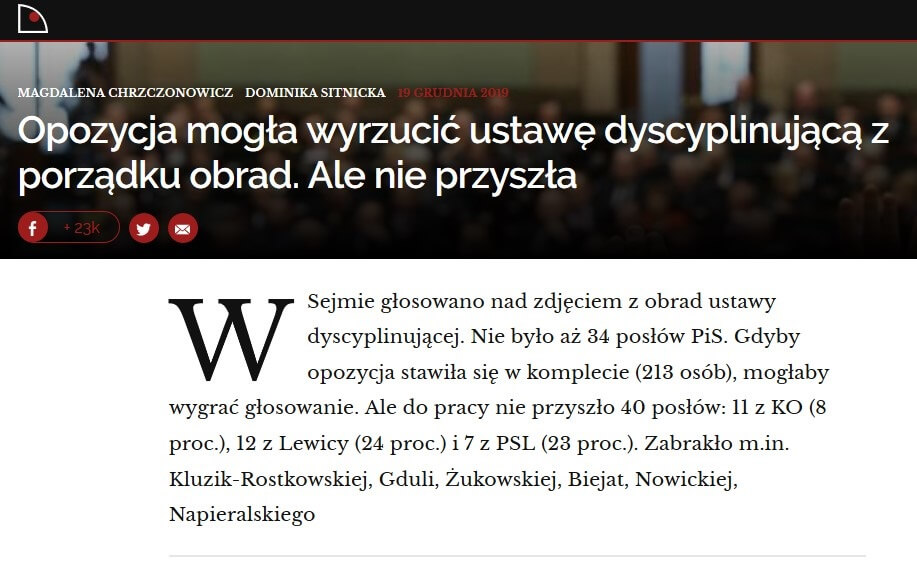To jest tak absurdalne, że mogło zdarzyć się tylko w demoludach. Obrońcy ojczyzny przed "najeźdźcami z PiSu", walczący o demokrację bojownicy z partii opozycyjnych, cały ten establishment żyjący z publicznych pieniędzy od dziesięcioleci i ci "nowi", te sejmowe świeżaki z lewicy pokazują faka wszytkim tym, którzy w grudniowy wieczór wychodzą na ulice polskich miast, żeby tym z opozycji dać wsparcie, zmobilizować ich do pracy, dać poczucie społecznego poparcia, poczucie sensu w tej orce na ugorze, którą jest ratowanie tego kraju przed nim samym i jego włodarzami. Bo jak okiem sięgnąć od ław opozycyjnych do ław rządowych, to samo.