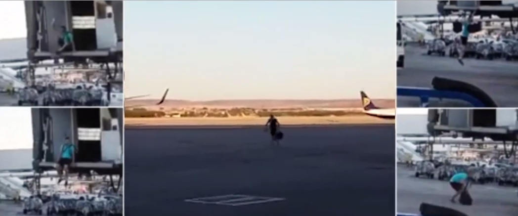 Na lotnisku w Madrycie doszło do niecodziennej sytuacji, kiedy to spóźniony na swój lot pasażer, skoczył z ponad 3-metrowej platformy na płytę lotniska i biegł z bagażami w ręku w stronę startującego właśnie samolotu linii lotniczych Ryanair. Całe szczęście, niesforny turysta został zatrzymany przez zszokowanych całym wydarzeniem pracowników portu lotniczego.
